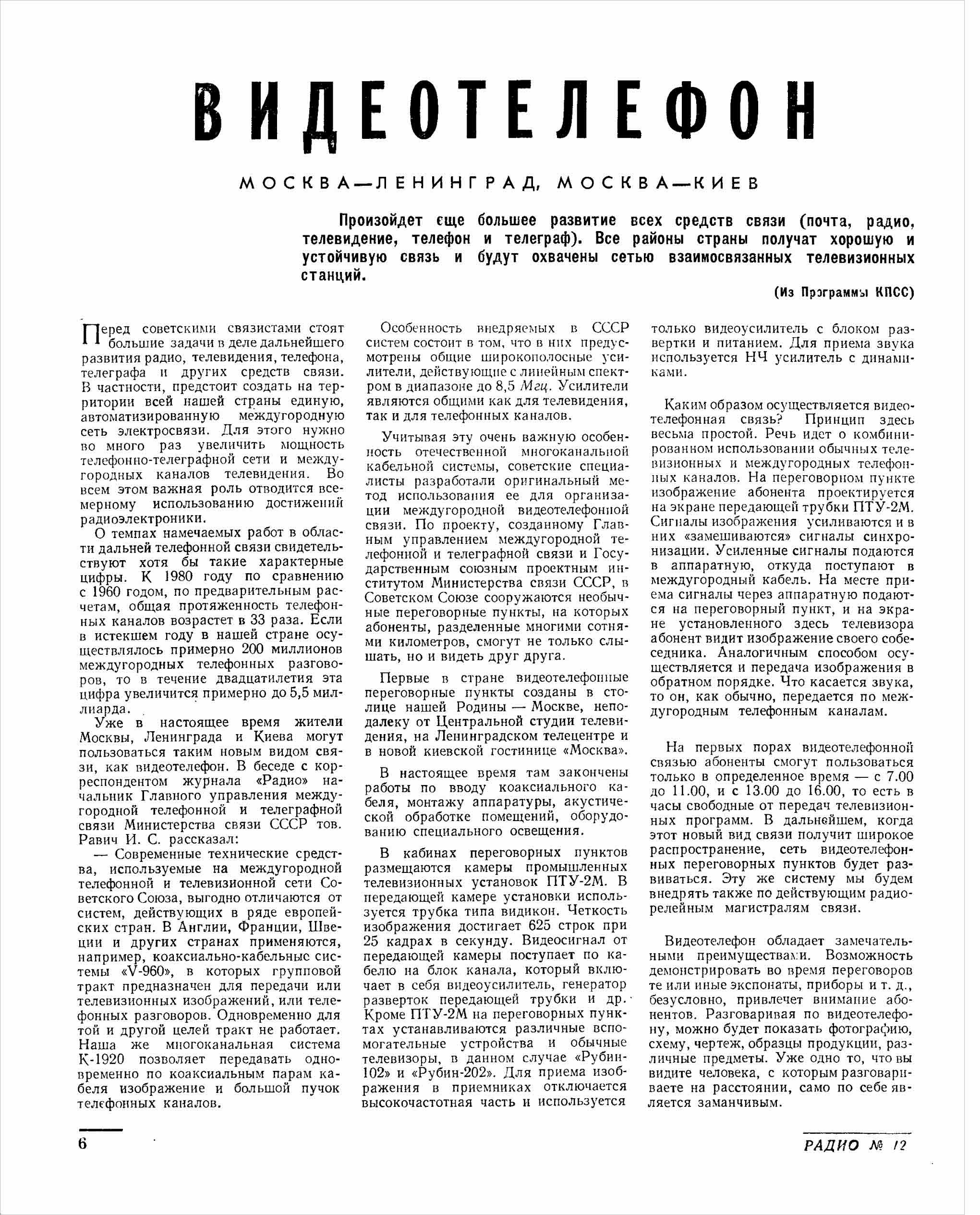 На первых порах видеотелефонной связью абоненты смогут пользоваться только в определенное время — с 7.00 до 11.00 и с 13.00 до 16.00, то есть в часы, свободные от передач телевизионных программ. В дальнейшем, когда этот новый вид связи получит широкое распространение, сеть видеотелефонных переговорных пунктов будет развиваться. Эту же систему мы будем внедрять также по действующим радиорелейным магистралям связи, - сообщал журнал. - Видеотелефон обладает замечательными преимуществами. Возможность демонстрировать во время переговоров те или иные экспонаты, приборы и т.д., безусловно, привлечет внимание абонентов. Разговаривая по видеотелефону, можно будет показать фотографию, схему, чертеж, образцы продукции, различные предметы. Уже одно то, что вы видите человека, с которым разговариваете на расстоянии, само по себе является заманчивым"